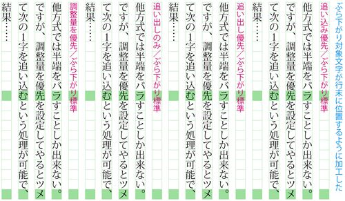 記事(及び画像)中で【行末約物】の扱いについて「全角/半角浮動」「全角/半角(浮動)」などと表記してあるものは「状況により全角/半角の二者択一」という意味であり、決して中間値を採るという意味ではありません。私の(用語的な)理解不足による不適切…