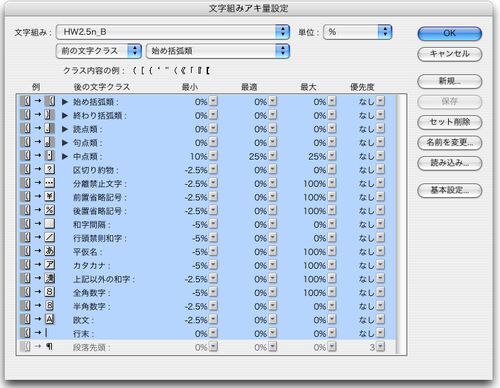 エライことになってしまった。 特殊なツメ組み用の「文字組みアキ量設定」が必要になり、まずはいつも使用しているモノをコピーして、全選択状態で優先度をすべて「なし」にしたモノを作成した後に、括弧類などを個別に変更するつもりだったが……。 全選択状…